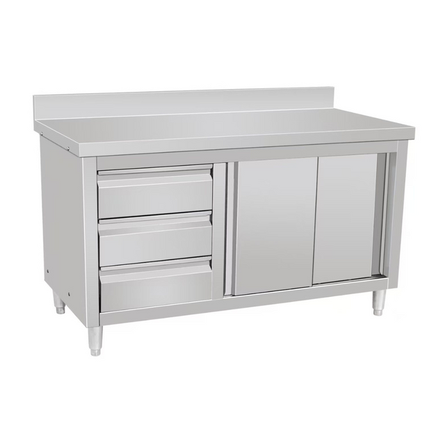 141065 - Stainless Steel Work Table Cabinet with Backsplash, Sliding Doors and 3 Drawers 1200 mm Wide