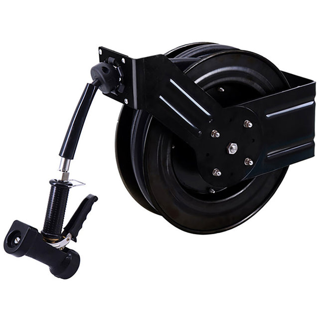 This heavy-duty 20M epoxy-coated steel hose reel in black is designed for durability, performance, and convenience in both industrial and commercial applications. Featuring a swing bracket with a dual temperature-adjustment check valve, it offers precise control for various water flow needs. The 5mm thick fixed side bracket steel plate and solid brass water inlet body ensure long-lasting use, while the 20m folding-resistant, 3-layer steel wire braided hydraulic hose provides superior temperature resistance from 4°C to 100°C and handles pressures from 300 PSI to 1000 PSI. Equipped with a brass casting nozzle featuring a front trigger and rubber protective cover, it allows gradual adjustment of the water spray pattern. Additional features include a stretching non-return positioning function, holding tube recycling, and a smooth automatic rewinding system for hassle-free storage.