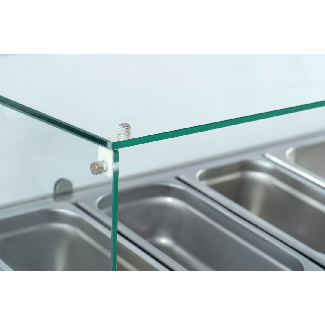 With its transparent glass, customers and staff can easily see the selection of salads and toppings available, making it a convenient and enticing way to showcase your menu offerings while protecting ingredients from contaminants. The counter features adjustable wells, allowing you to customise the arrangement to accommodate different container sizes and quantities.