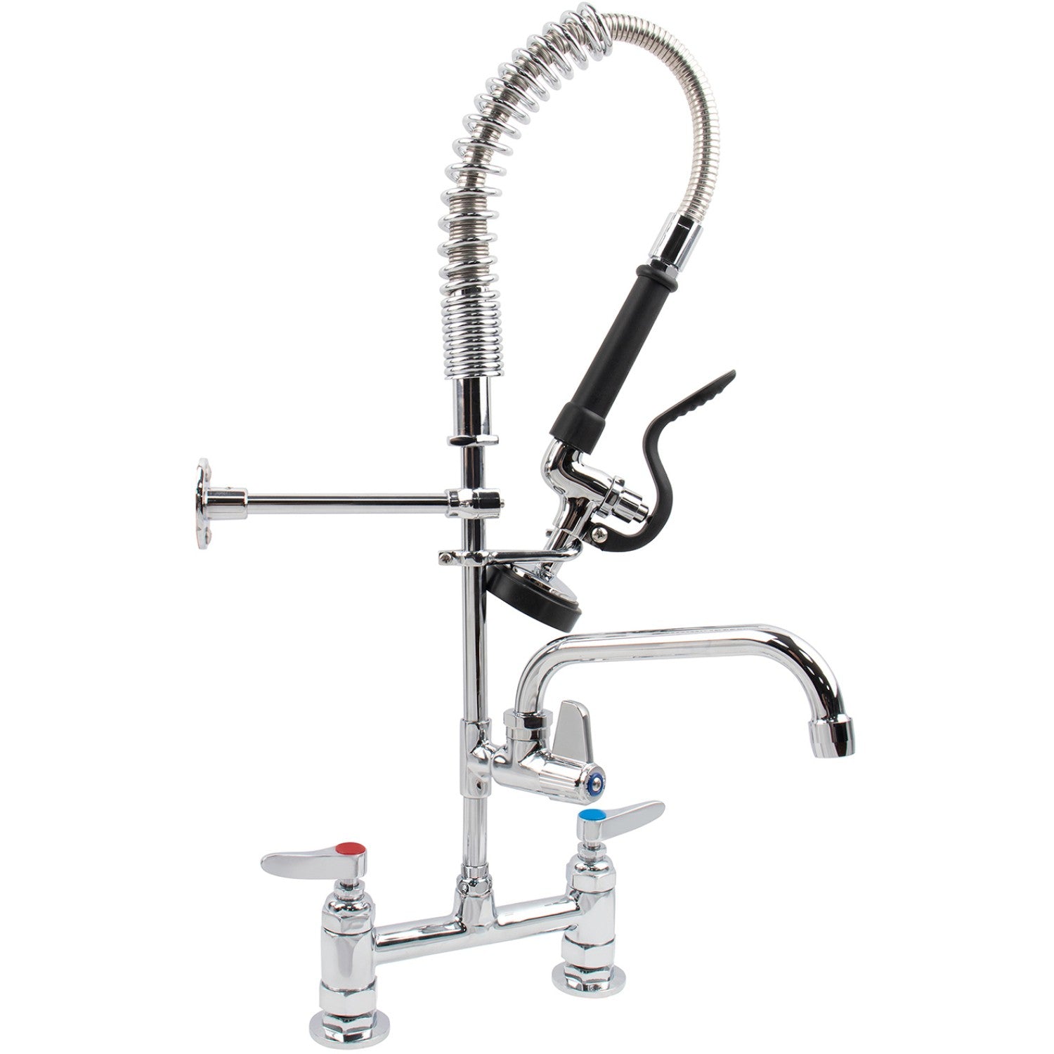 Includes a 4" adjustable wall bracket, spray valve holder, and overhead spring for added stability and convenience. Perfect for busy commercial kitchens requiring a compact, dual-function pre-rinse system.
