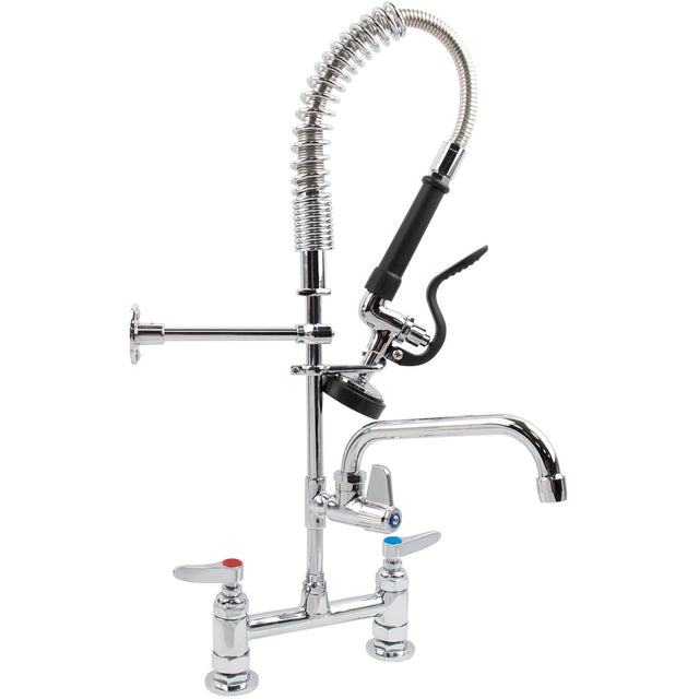 A high-quality mini pre-rinse unit designed for commercial kitchens, combining powerful cleaning performance with a convenient 8" swing faucet for versatile use. Built with a polished chrome plated brass body and an 8" riser, it offers both durability and professional style.