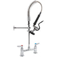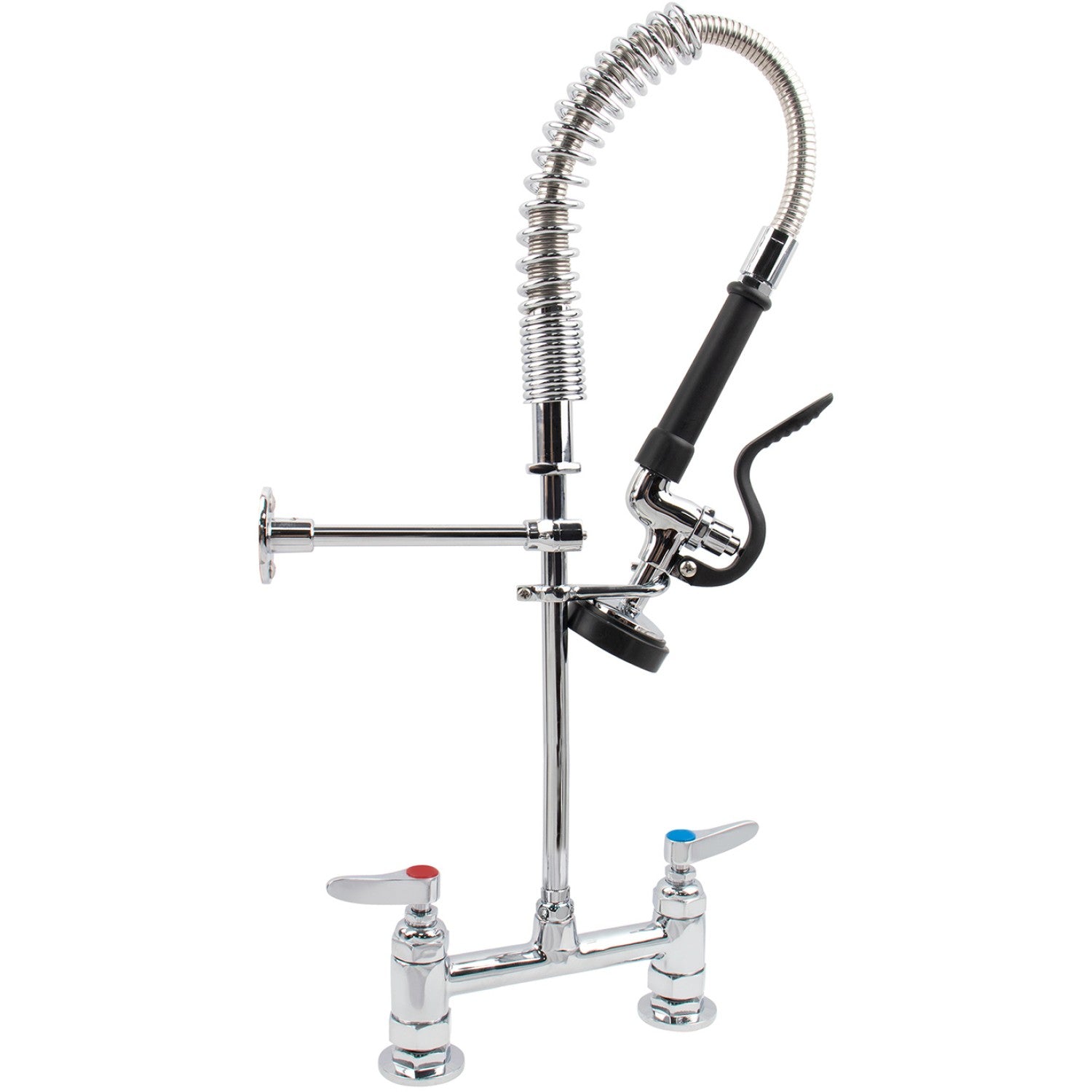Compact yet powerful, this 6-inch mini dual temperature pre-rinse faucet is designed for professional kitchens that demand reliability and performance in tight spaces. Featuring a polished chrome-plated brass body, an 8-inch riser, and an 18-inch flexible stainless steel hose with a heat-resistant handle, this unit delivers exceptional durability and ease of use. The 1.42 GPM spray valve provides strong water flow for quick rinsing, while compression cartridges with spring checks ensure smooth operation and prevent backflow. Equipped with lever handles for precise temperature control, a 4-inch adjustable wall bracket, spray valve holder, and overhead spring, this pre-rinse unit is built for heavy-duty daily use.