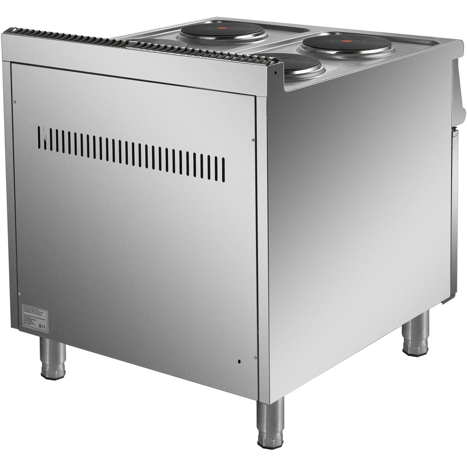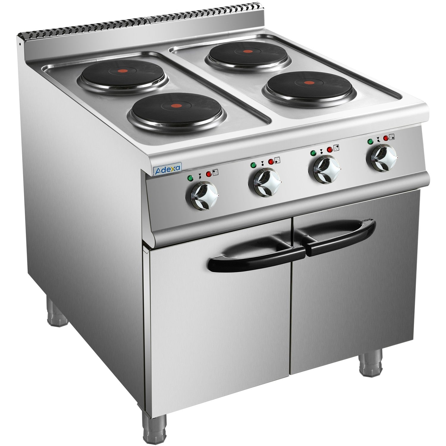 Heavy duty, high quality 4 burner electric cooker with cabinet base constructed from stainless steel. This electric range oven has a depth of 900mm to seamlessly fit in with our modular cooking range.