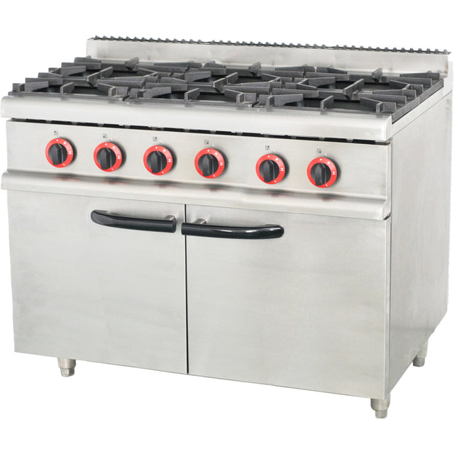 This heavy-duty free-standing commercial gas range with cabinet is designed for demanding kitchen environments in restaurants, catering operations, and takeaway shops. Built from durable stainless steel, this model features six powerful open burners and a convenient cabinet base for extra storage – making it a versatile, space-saving solution for any professional kitchen.