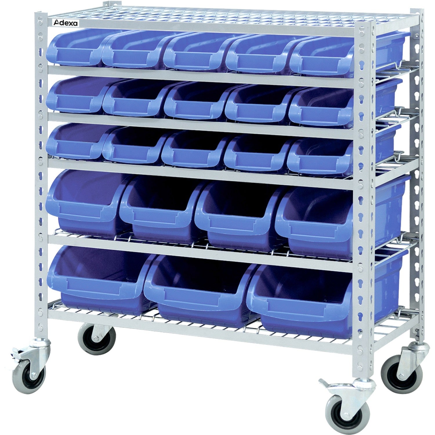 This heavy duty mobile shelving unit is perfect for storage areas, warehouses, garages or any empty wall where some extra storage would be useful. Featuring 22 plastic storage bins, this shelving unit is the ideal storage solution for small parts.