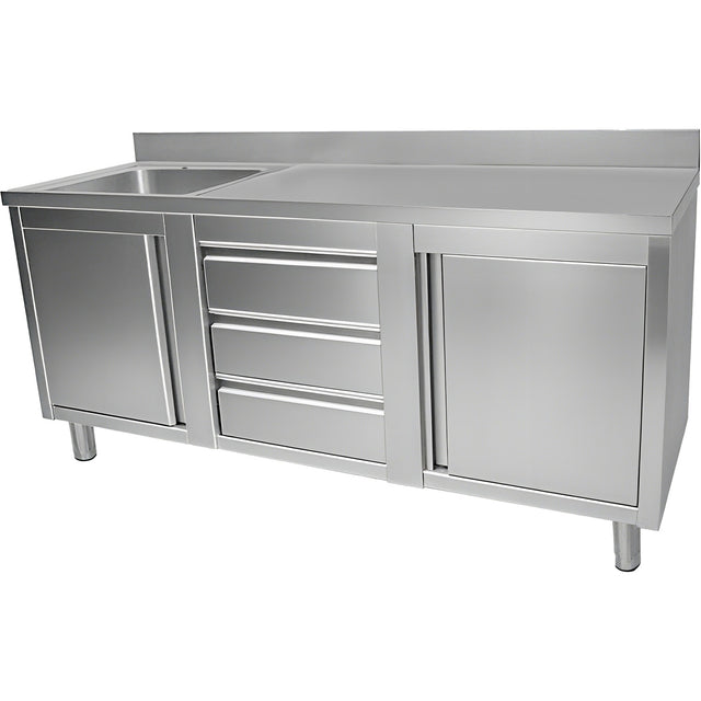 Upgrade your commercial kitchen with this versatile stainless steel sink and storage unit. Featuring a left-positioned single bowl sink with two hinged door cabinets beneath and three smooth-gliding drawers in the middle, this unit offers excellent utility and space optimization. The hygienic stainless steel surface is easy to clean and durable for everyday use. Ideal for food prep areas, dishwashing zones, and utility spaces.