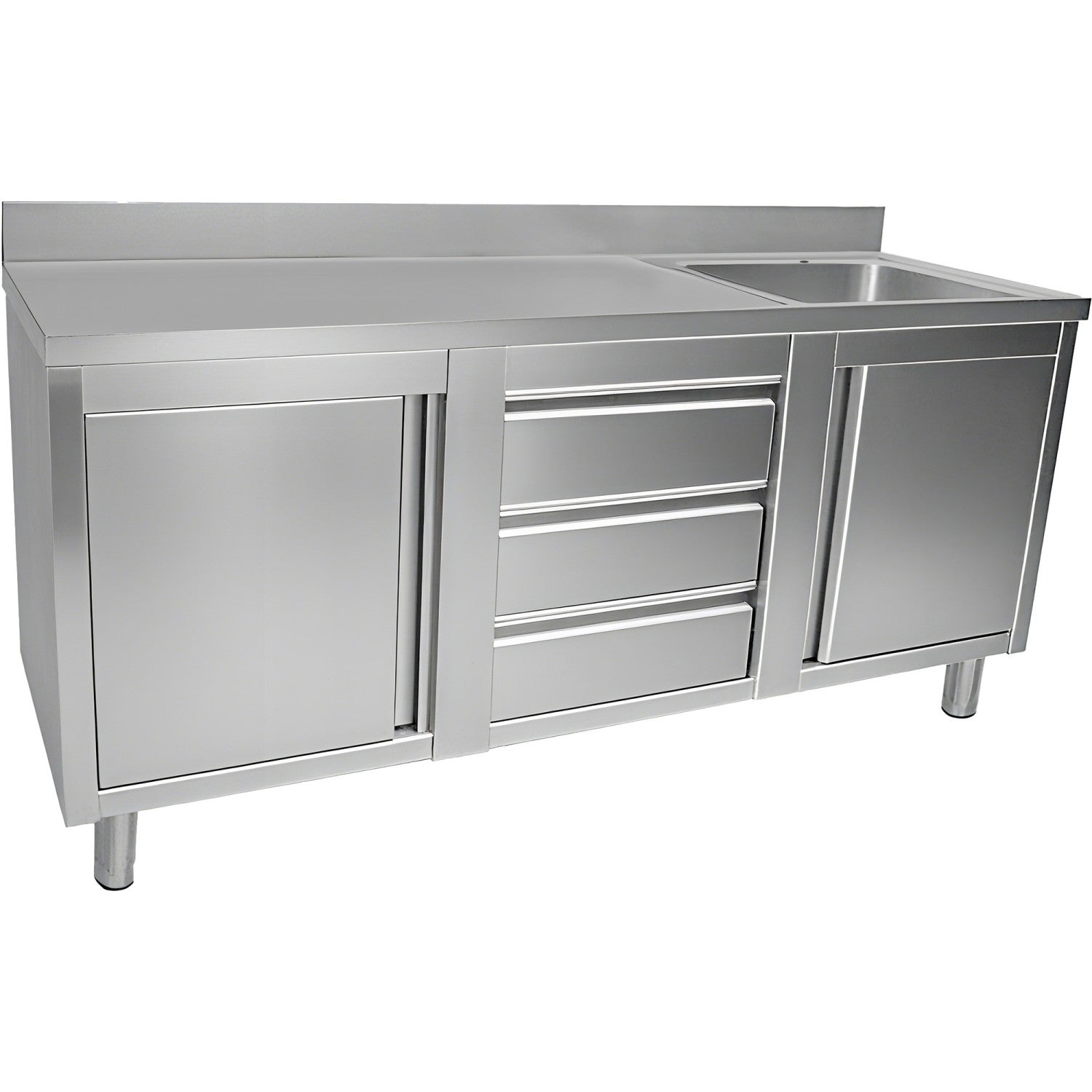 Upgrade your commercial kitchen with this versatile stainless steel sink and storage unit. Featuring a right-positioned single bowl sink with two hinged door cabinets beneath and three smooth-gliding drawers in the middle, this unit offers excellent utility and space optimization. The hygienic stainless steel surface is easy to clean and durable for everyday use. Ideal for food prep areas, dishwashing zones, and utility spaces.