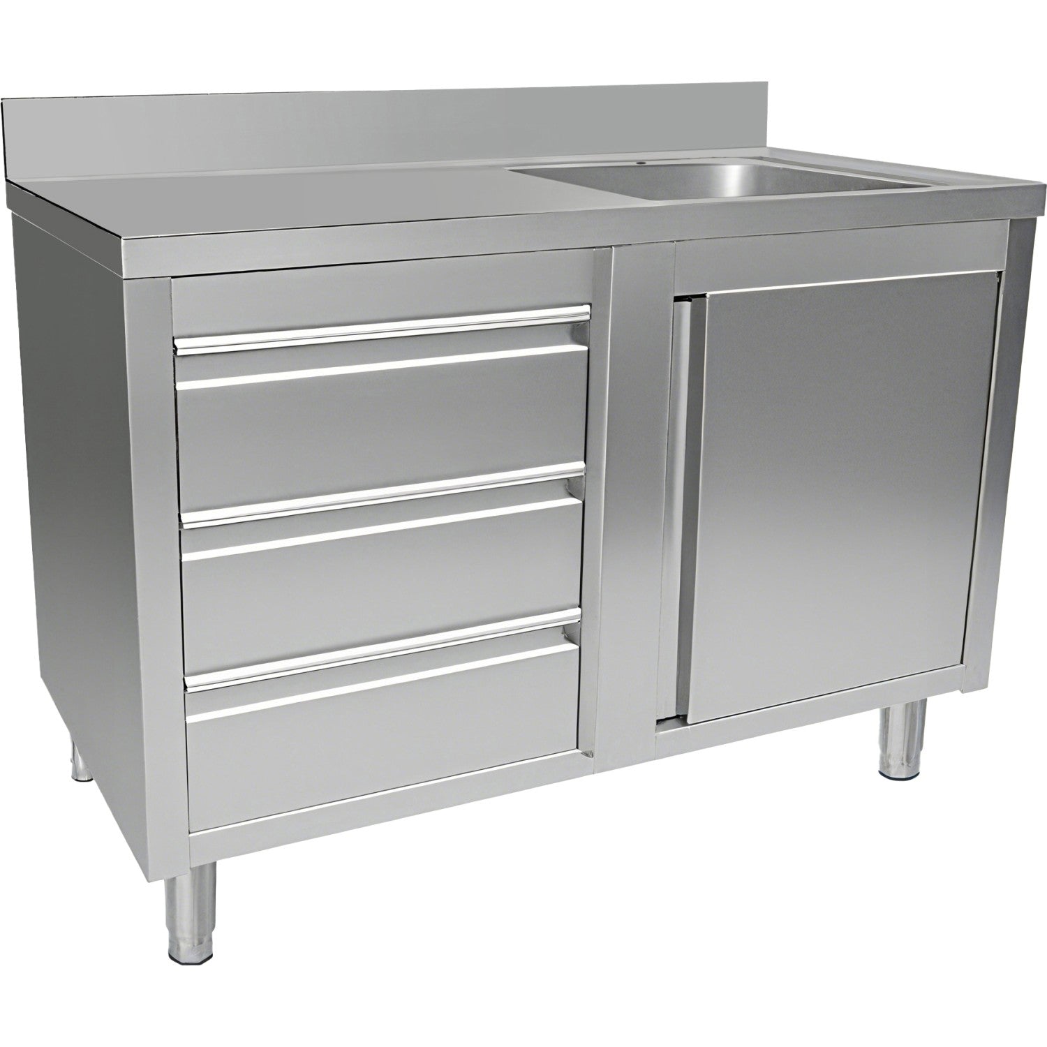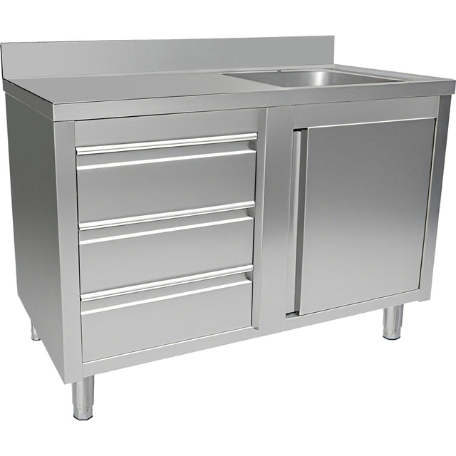 Upgrade your commercial kitchen with this versatile stainless steel sink and storage unit. Featuring a right-positioned single bowl sink with a hinged door cabinet beneath and three smooth-gliding drawers on the left, this unit offers excellent utility and space optimization. The hygienic stainless steel surface is easy to clean and durable for everyday use. Ideal for food prep areas, dishwashing zones, and utility spaces.