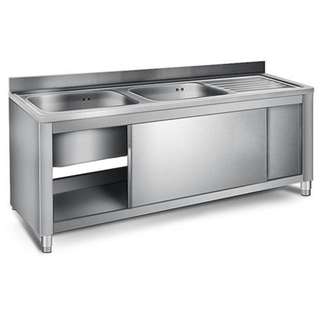 Commercial Sink With Cupboard Stainless Steel 2 Bowls Left Splashback Width 1400mm Depth 600mm | Thssr146 Bl2 is backordered and will ship as soon as it is back in stock.