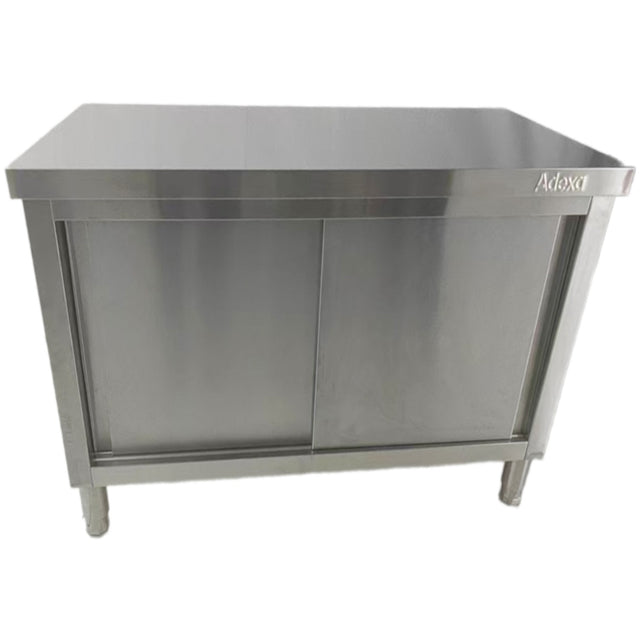 The Adexa QNH322 is a robust stainless steel work table designed for heavy-duty commercial kitchen use. It features sliding doors for convenient access, a spacious internal storage area, and a reinforced top bench. With its clean design and practical dimensions, this workbench helps streamline kitchen operations while keeping essential items organized and out of sight.