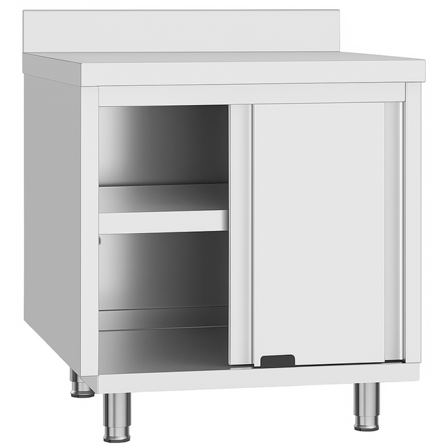 This versatile stainless steel work table with sliding doors and integrated splashback, is ideal for professional kitchens, food prep stations, and commercial catering environments. With its enclosed cabinet design, it offers a hygienic storage solution while maximising workspace. The smooth sliding doors ensure easy access, while the raised rear edge helps contain spills and maintain cleanliness. Built from durable stainless steel, it is designed to withstand daily commercial use while remaining easy to clean and maintain.
