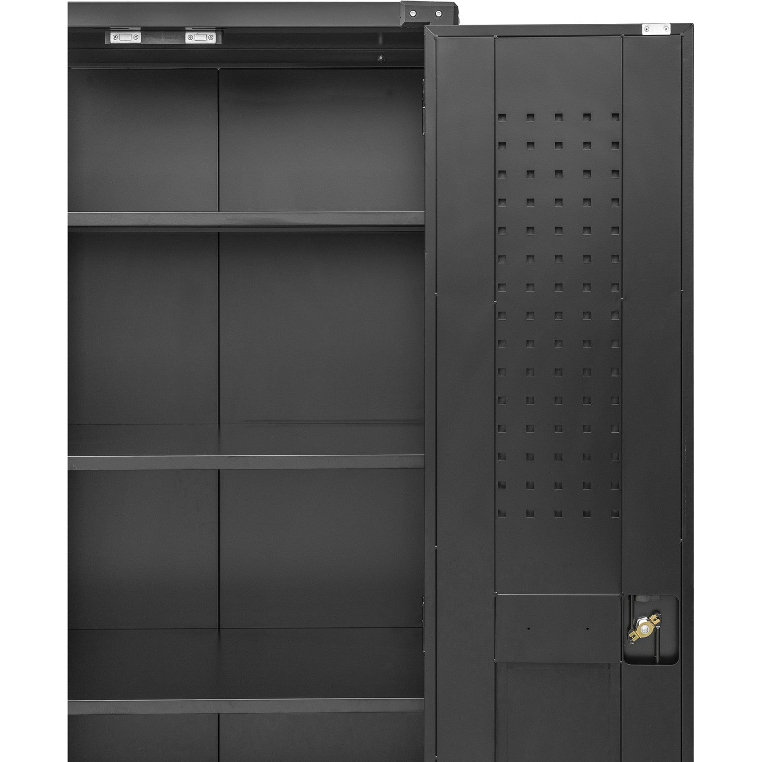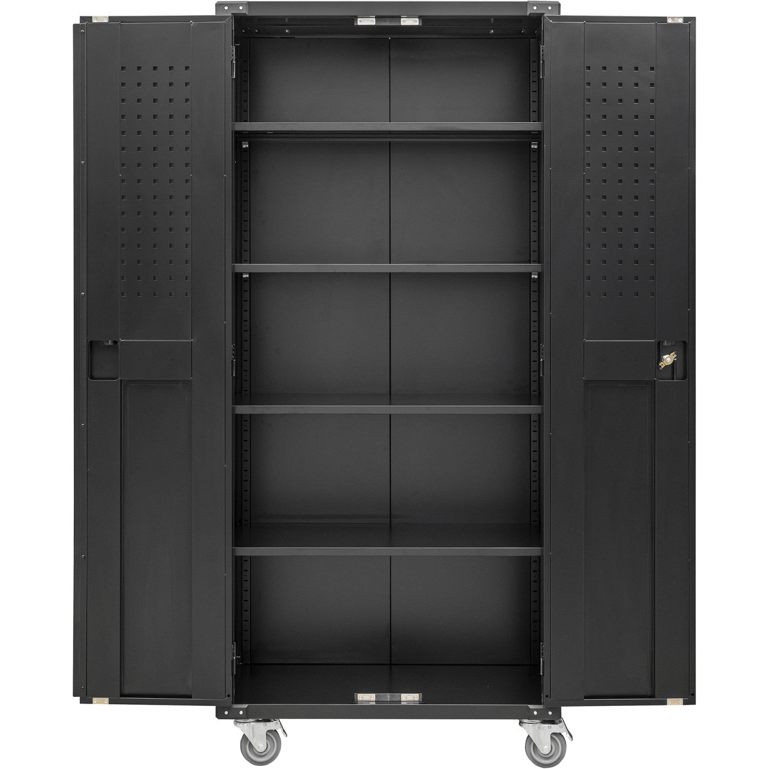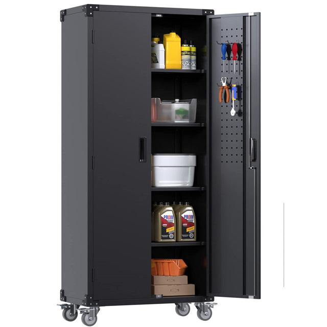 This mobile metal storage cabinet is ideal for any warehouse or garage, thanks to the sturdy construction and convenient design. Equipped with 4 castors, 4 interior shelves, and pegboard doors, this cabinet has a gerenous storage capacity while remaining easy to transport. The 4 wheels are fitted with brakes to ensure safe and secure storage.