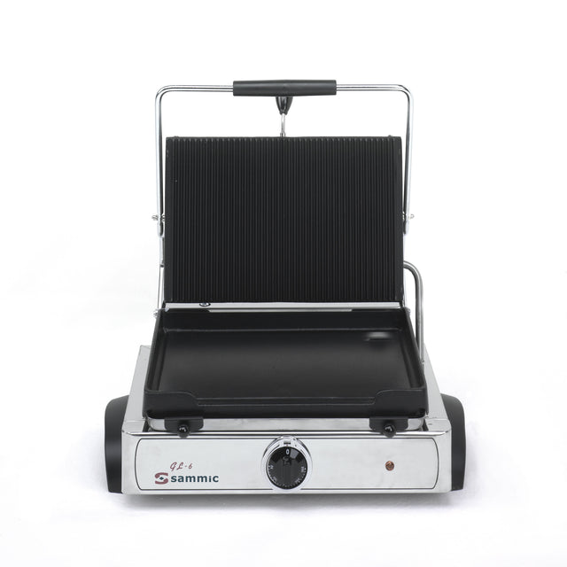 Medium-sized ribbed electric contact grill in cast iron alloy.