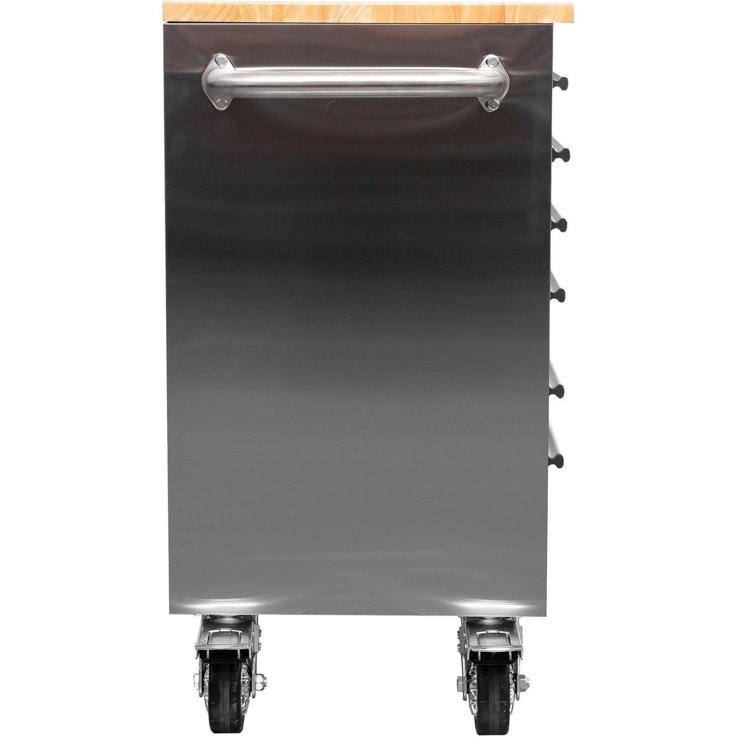 This 48-inch Stainless Steel Rolling Tool Cabinet offers professional-grade storage and a sturdy work surface for workshops, garages, and industrial environments. Built with a durable stainless steel frame and galvanised steel drawer bodies, it features a 25mm full-size rubberwood worktop, making it ideal for tool storage and light-duty work tasks.