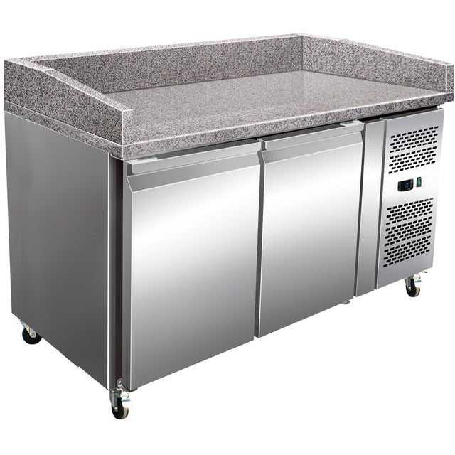 High quality commercial refrigerated pizza prep table made in stainless steel with 2 doors and 1 shelf per door. Granite worktop, ventilated cooling and automatic defrost. A temperature range of +2 to +8°C and digital display. A perfect professional addition to any pizzeria or sandwich shop.