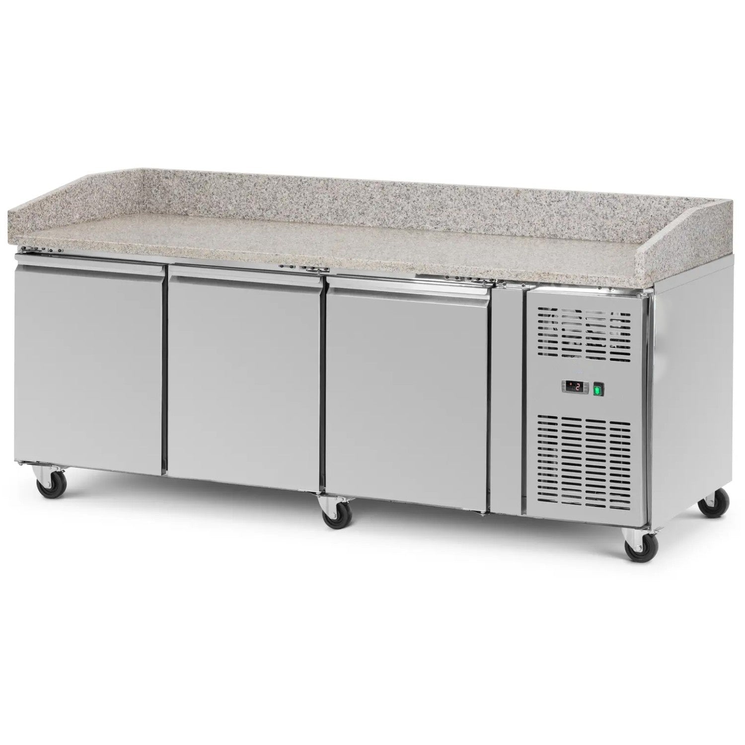 Prepare delicious pizzas quickly and easily with this top-of-the-line Refrigerated Pizza Preparation Table! This commercial-grade stainless steel model features 3 doors, 1 shelf per door, a granite worktop, and ventilated cooling. The digital display shows a temperature range of +2 to +8°C, ensuring perfect pizza prep every time. Experience professional pizza making with this high-quality addition to your pizzeria.