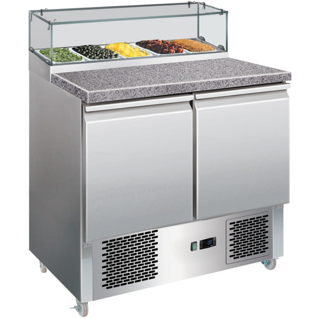 Professional preparation table ideal if you're prepping pizza, sandwiches, wraps or salads, this refrigerated prep counter offers generous chilled storage and highly convenient rapid access to ingredients. The heavy duty marble countertop helps making pizza a breeze thanks to the cool, stick-resistant material. Inside, the fridge offers full size gastronorm pan compatibility, meaning you can quickly transfer food between restaurant appliances. A great quality catering prep fridge.