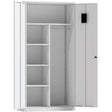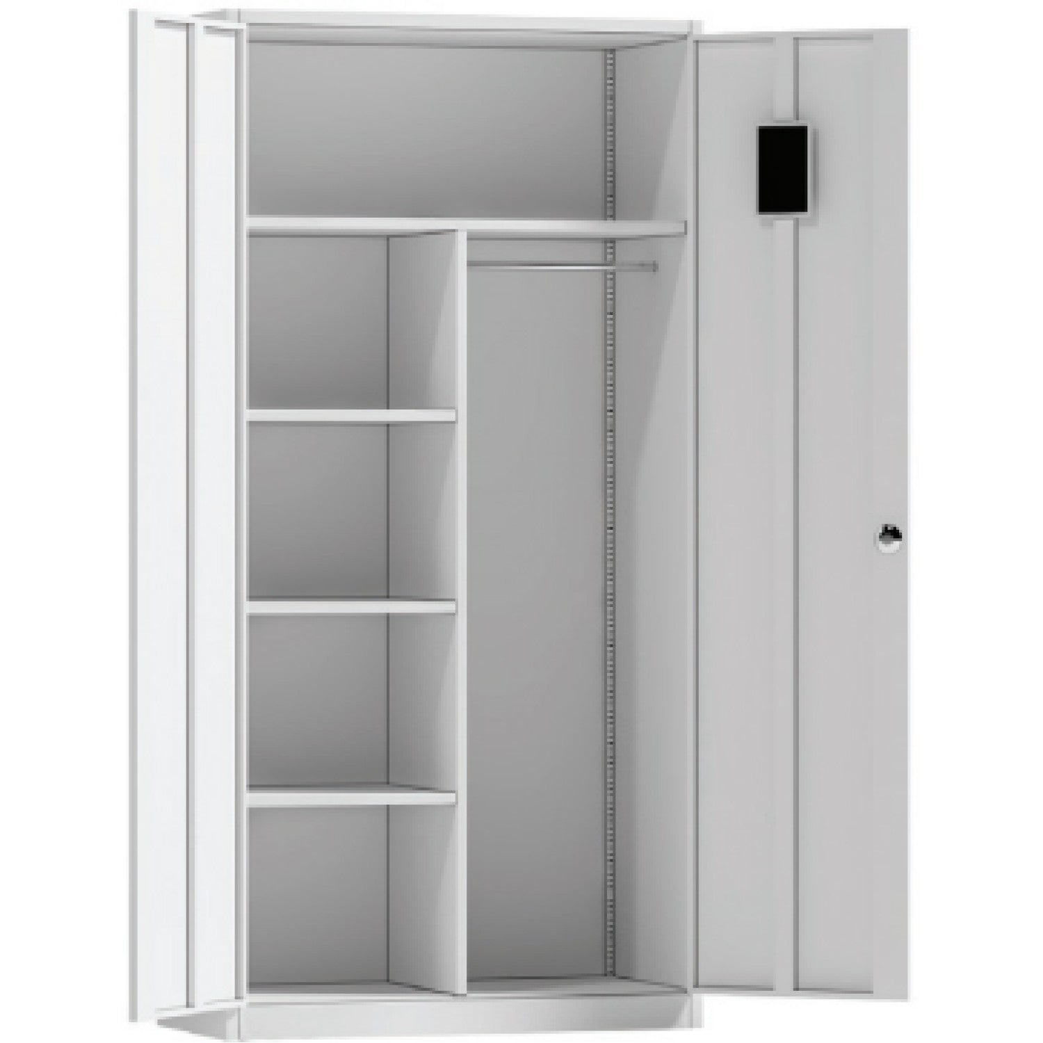 This sleek double-door filing cabinet with locker is crafted from durable 0.6mm cold-rolled steel and finished in a clean RAL9011 white powder coating for a modern, long-lasting look. The compartment includes four fixed shelves, a sturdy hanging rod and an mirror, offering convenience and privacy. Ideal for workplace, gym, or school environments, it combines security with practical storage.