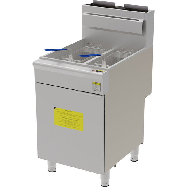 Equipped with two large baskets and compatible with both LPG and natural gas, it provides excellent versatility and throughput in a compact footprint. Its durable stainless steel construction and deep fry tank design make it easy to clean and maintain during busy service periods.