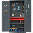 This Professional Tool Storage Cabinet offers robust organisation for workshops, garages, and industrial environments. Built from heavy-duty 0.7mm cold-rolled steel and finished in a durable black-sand powder coating, it ensures long-lasting performance. The cabinet features a perforated pegboard back and door panels for hanging tools, two smooth-sliding drawers for smaller items, and two fixed shelves for larger equipment. Its spacious design keeps tools accessible, secure, and neatly stored, making it an essential for any professional workspace.