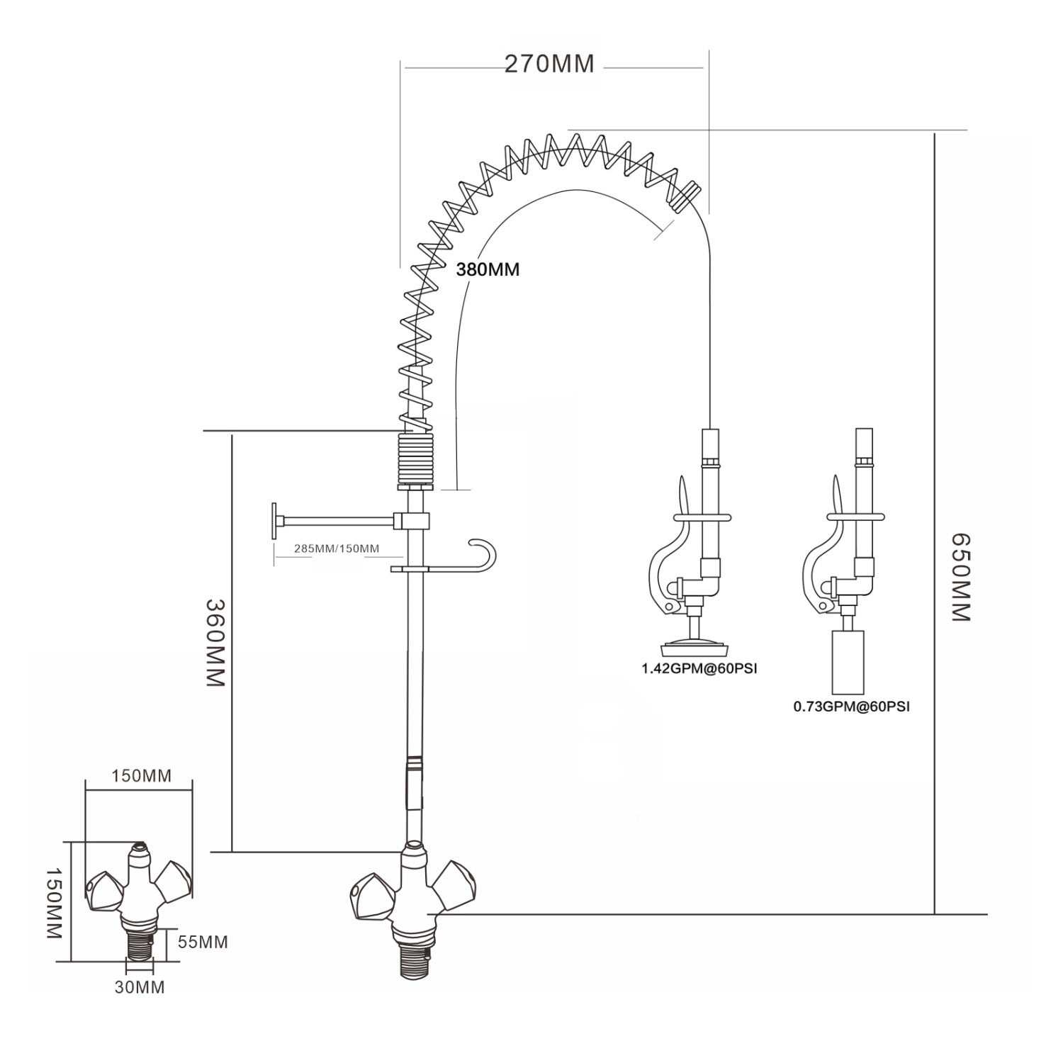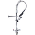 Heavy-duty single hole deck mount pre-rinse faucet designed for high-demand commercial kitchens. Built with a polished chrome plated brass body, 20" riser, and extra-long 37" flexible stainless steel hose with a heat-resistant handle for extended reach. Features a 1.42 GPM spray valve for powerful cleaning performance and durable ceramic cartridges for smooth, long-lasting operation.