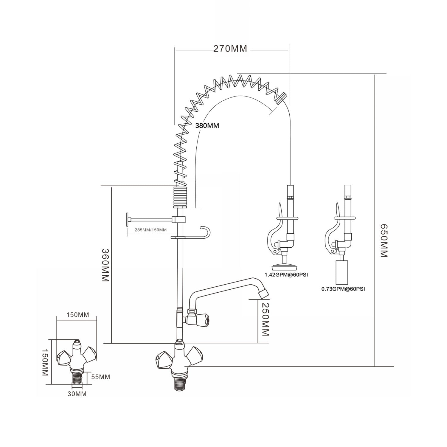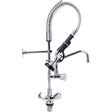 Premium commercial pre-rinse faucet with add-on swing nozzle, ideal for multitasking in busy kitchens. This single hole deck mount unit combines a polished chrome plated brass body, 20" riser, and 37" flexible stainless steel hose with a heat-resistant handle for maximum durability and reach. The high-efficiency 1.42 GPM spray valve delivers powerful cleaning, while the integrated 8" swing nozzle allows for fast pot filling and rinsing without changing stations.